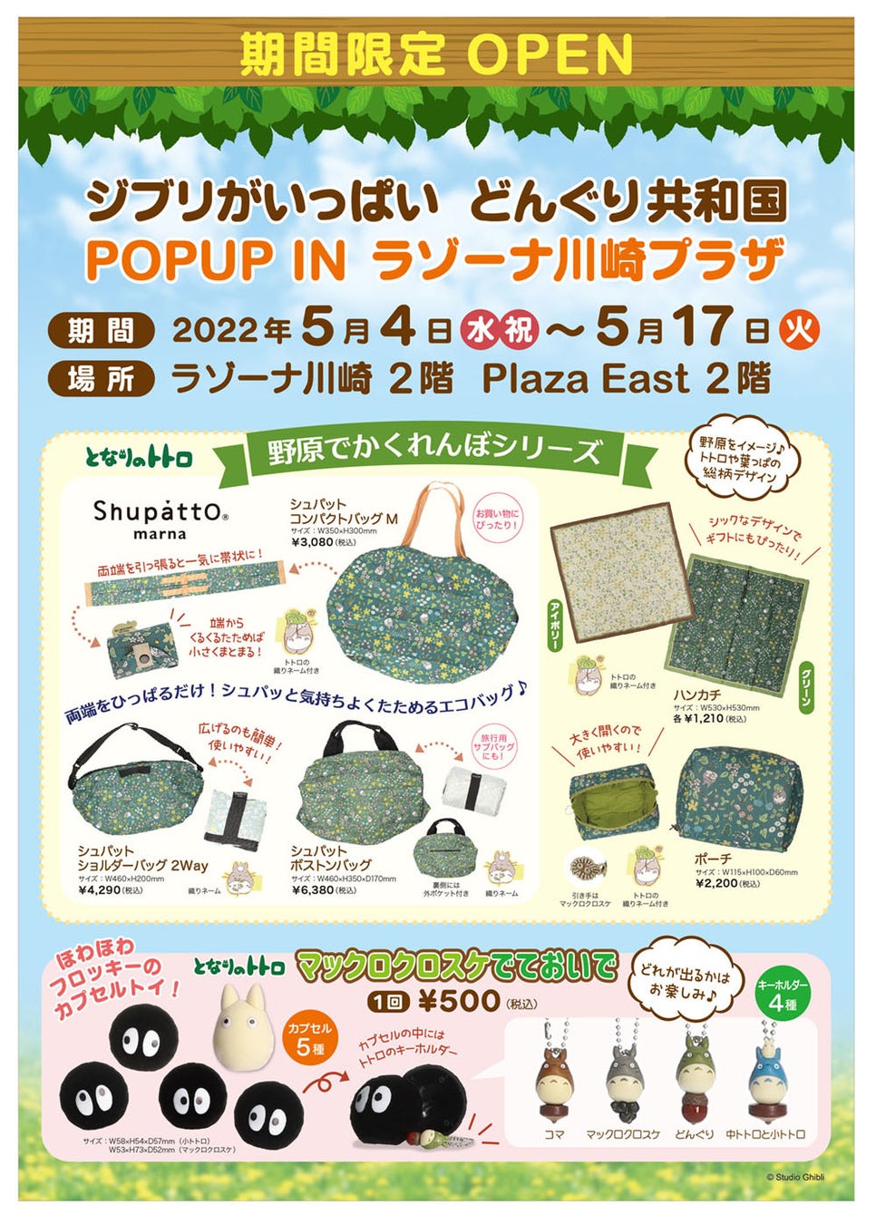 店頭には両端を引っ張るだけで一気にたためるバッグが人気の「Shupatto」がラインアップに含まれた、野原でかくれんぼをするトトロたちがさわやかなデザインの新商品シリーズ「となりのトトロ 野原でかくれんぼシリーズ」や、ジブリがいっぱい どんぐり共和国の店頭にだけ設置されている、中身のボールチェーン付きマスコットはもとより、パッケージのカプセルまでコレクションしたくなるカプセルトイ「マックロクロスケでておいで」など、限定商品を数多く取り揃えます。