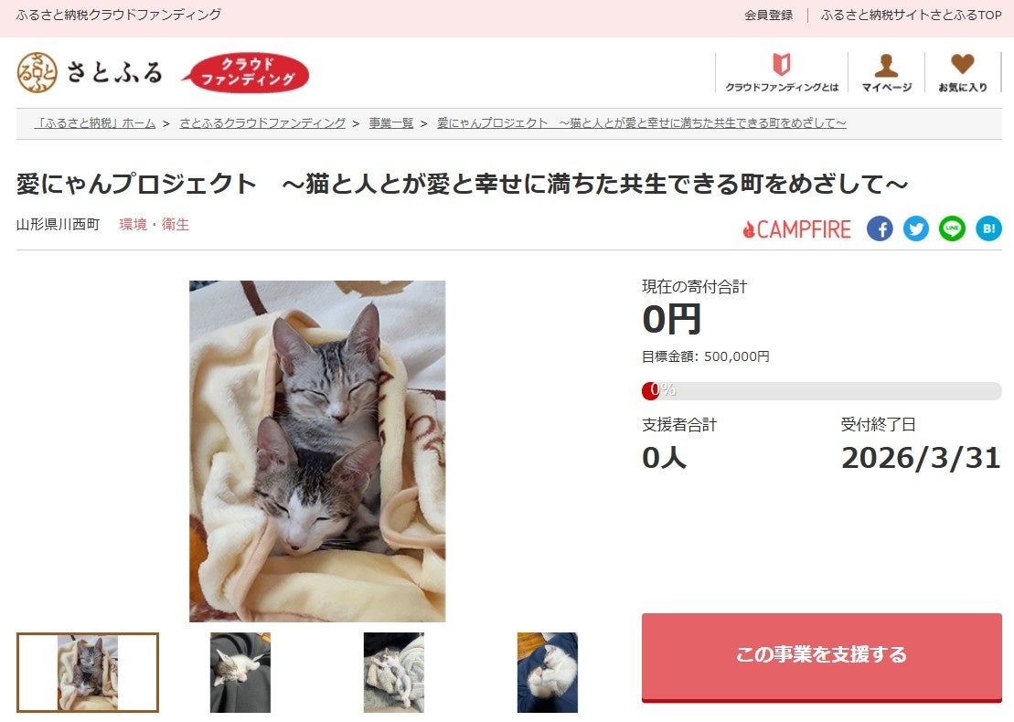 山形県川西町とふるさと納税ポータルサイト「さとふる」を運営する株式会社さとふる(本社:東京都中央区、代表取締役社長 兼 CEO:藤井 宏明)は、「さとふるクラウドファンディング」にて、「愛にゃんプロジェクト ~猫と人とが愛と幸せに満ちた共生できる町をめざして~」の寄付受け付けを2025年9月1日より開始します。