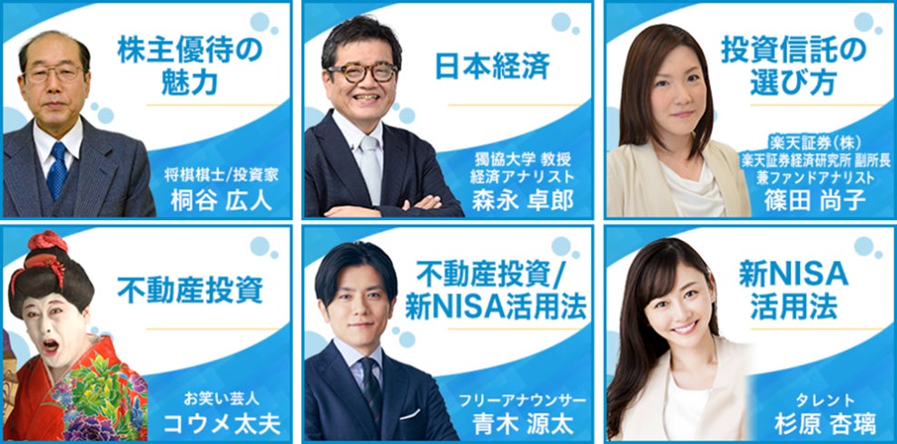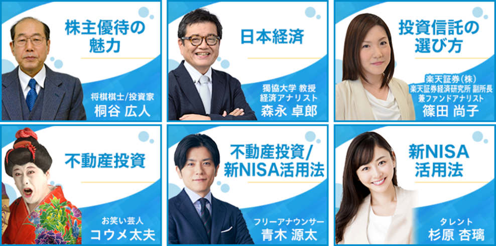 【森永卓郎氏】【桐谷広人氏】など、メディアでも注目されている講師が連日登壇し、【株式投資・米国株・投資信託・不動産投資・NISA・ライフプラン・為替】など、基礎から上級編まで多様なテーマで講演します。