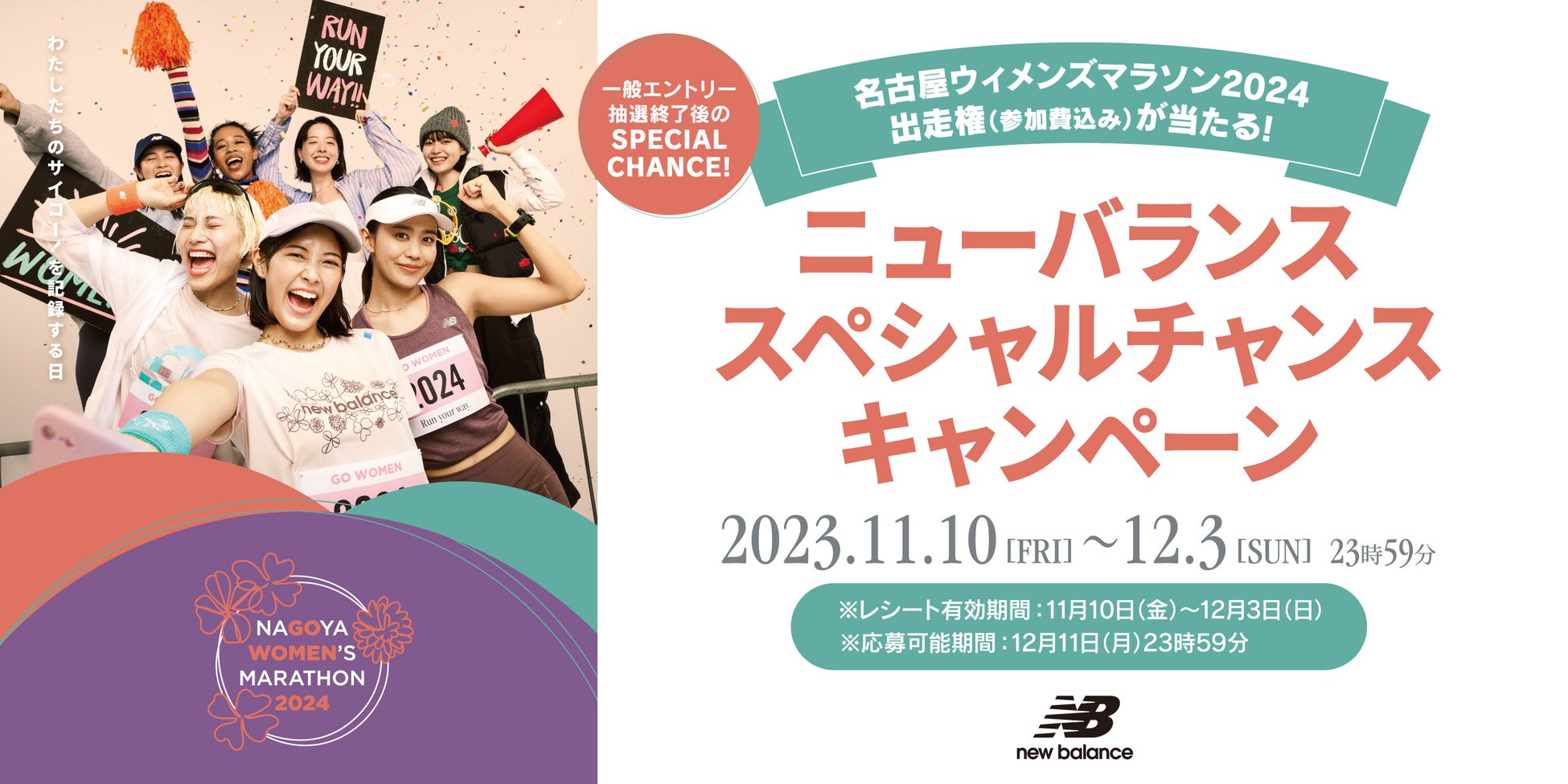 「名古屋ウィメンズマラソン2024」の一般エントリー受付、抽選終了後も、出走権を獲得できる「ニューバランス スペシャルチャンスキャンペーン」を、11月10日(金) ~ 12月3日(日)まで開催いたします。