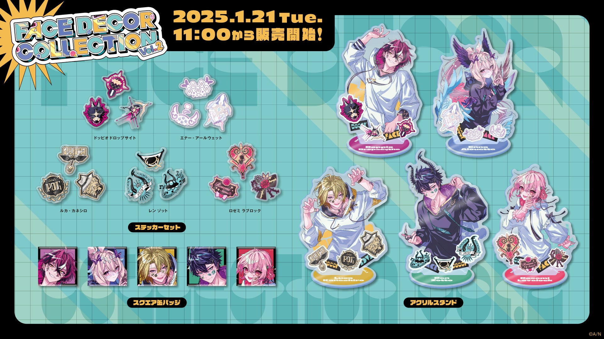 「FACE DECOR COLLECTION Vol.2」は、2025年1月21日(火)11時(JST)から、にじさんじオフィシャルストア(https://shop.nijisanji.jp/)とNIJISANJI EN Official Store(https://nijisanji-store.com/)にて販売を開始いたします。
