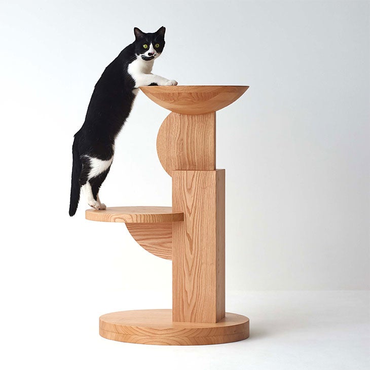 飛騨産業(株)の木工技術により、幾何学的な形の組み合わせが生み出すハッピーなフォルムの猫を愛でるための台「medel(メデル)」。