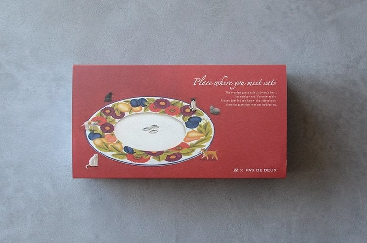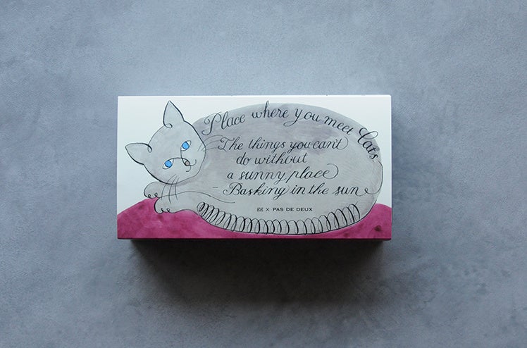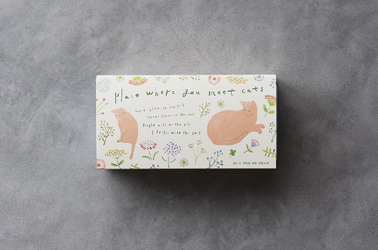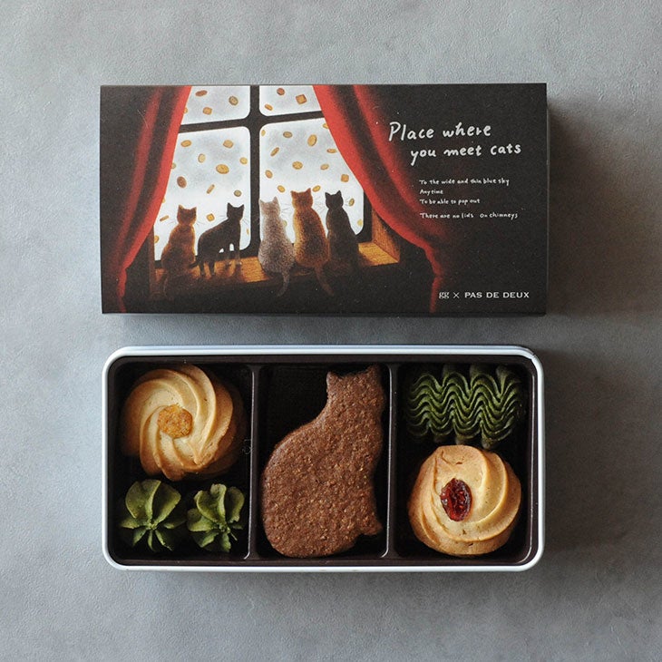 雑貨屋ggと東大宮の洋菓子店PAS DE DEUX のコラボ企画、保護猫を応援する「Place where you meet cats」クッキー缶。企画に賛同するアーティスト10人がパッケージデザインを手掛けた12作品からお好きなデザインの箱をお選びいただけます。国内産の厳選された素材にこだわり丁寧に焼き上げた猫をモチーフにしたかわいいクッキー缶はアートを気軽に楽しめます。