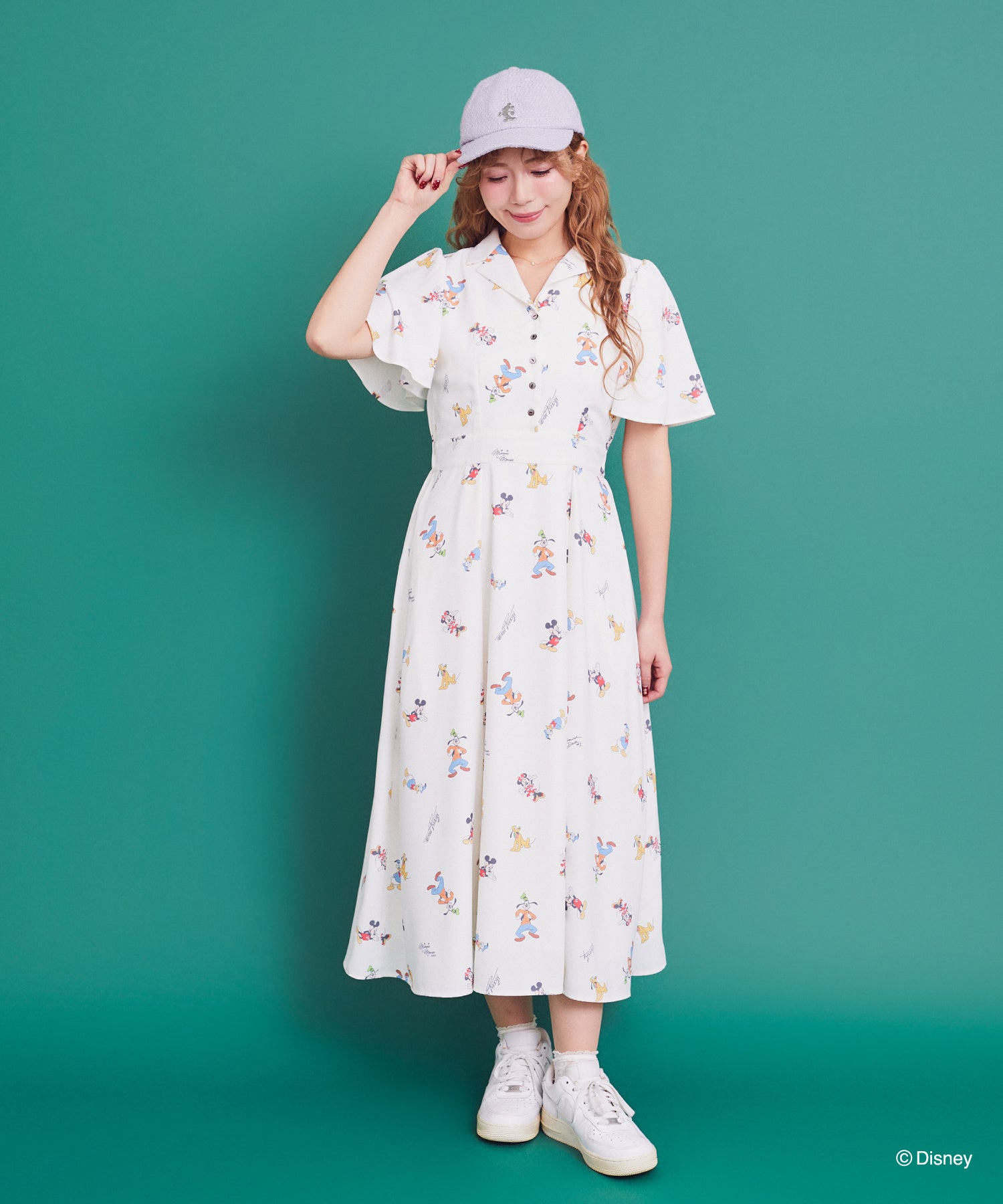 「ミッキー&フレンズ」をレトロなタッチで表現した、オリジナルの総柄アイテムは3型ラインアップ。チュニック風ブラウスと開襟デザインのワンピースは、腕や腰回りなど体型のお悩みをさりげなくカバーできるシルエットに仕上げました。開襟デザインのロンパースは、パンツならではの動きやすさがポイント。インナーや羽織との組み合わせ次第で、幅広いコーディネートをお楽しみいただけます。