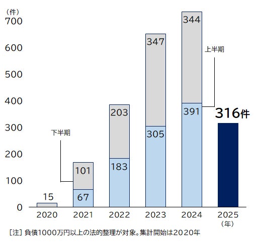 「実質無利子・無担保融資(ゼロゼロ融資)」を受けていたものの倒産した「ゼロゼロ(コロナ)融資後倒産」は、2025年上半期に316件判明した。前年同期(391件)から75件減少したものの、3年連続で300件を超えた。2020年7月に初めて倒産が確認されて以降の累計は2272件となった。物価高や人手不足などの経営リスクを抱えるなか、「金利のある世界」に戻り、「ゼロゼロ融資後倒産」のリスクは引き続き高水準で推移するとみられる。