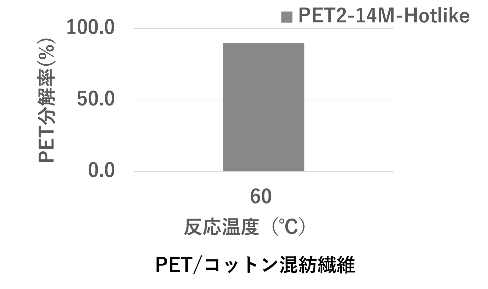 「PET2」を改変した「PET2-14M-Hotlike」を作製し、PETとポリウレタン、PETとコットンの2種類の混紡繊維中のPETを選択的に分解できることを確認しました。さらに、PETとコットンの混紡繊維中のPET分解の検証において、PET分解率が世界最高値の90%※4となり、その際に使用した酵素の量と分解までにかかった時間から、世界最高の分解効率※4であることを確認しました。