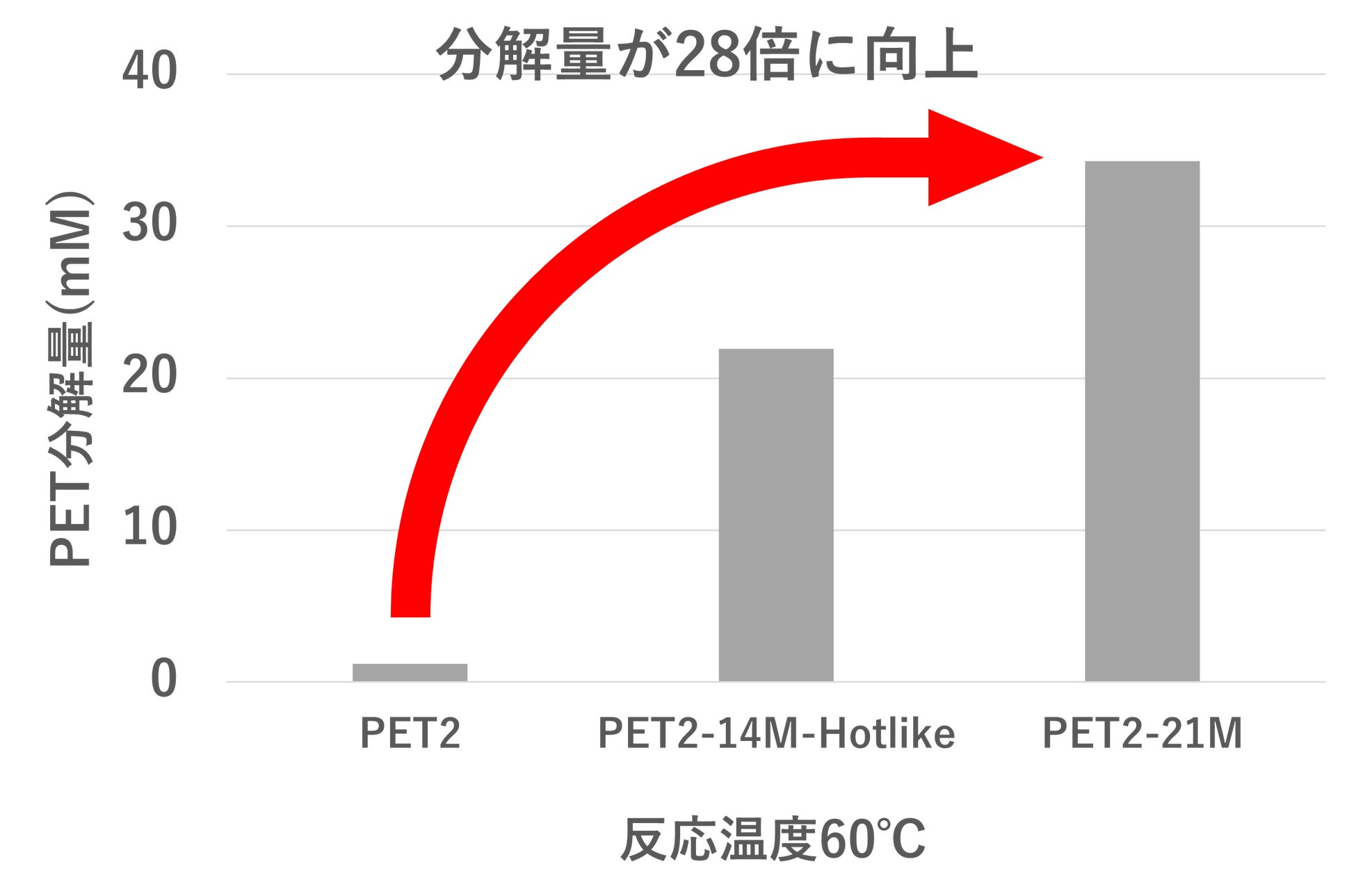 「PET2-14M-Hotlike」を基盤に酵素の機能を保つために必要な熱安定性とPET分解の活性をさらに向上させる「PET2-21M」の作製に成功しました。ペットボトルの検証において、反応温度60度でPETを分解する量が、改変前の酵素「PET2」と比較し28倍に向上することを確認しました。