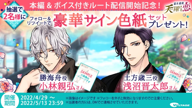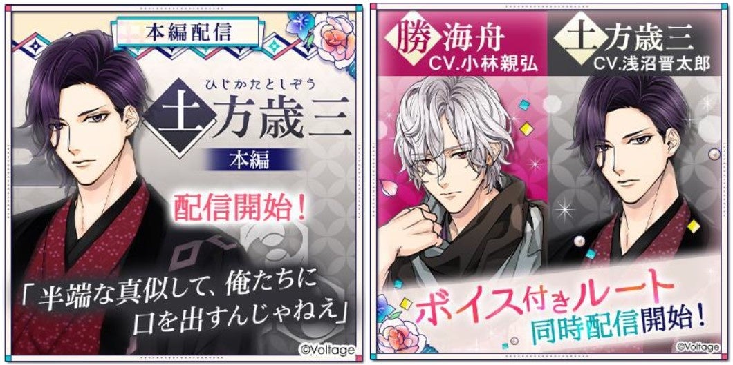 ボルテージ最新作「幕末維新 天翔ける恋」土方歳三( CV:浅沼晋太郎)の本編ストーリーとボイス付きルート、勝海舟(CV:小林親弘)のボイス付きルートが5月2日(月)より配信開始!
