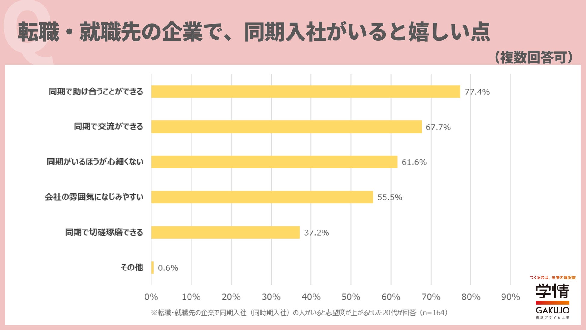 同期入社がいると嬉しい点は、「同期で助け合うことができる」77.4%が最多。次いで、「同期で交流ができる」67.7%、「同期がいるほうが心細くない」61.6%が続きました。