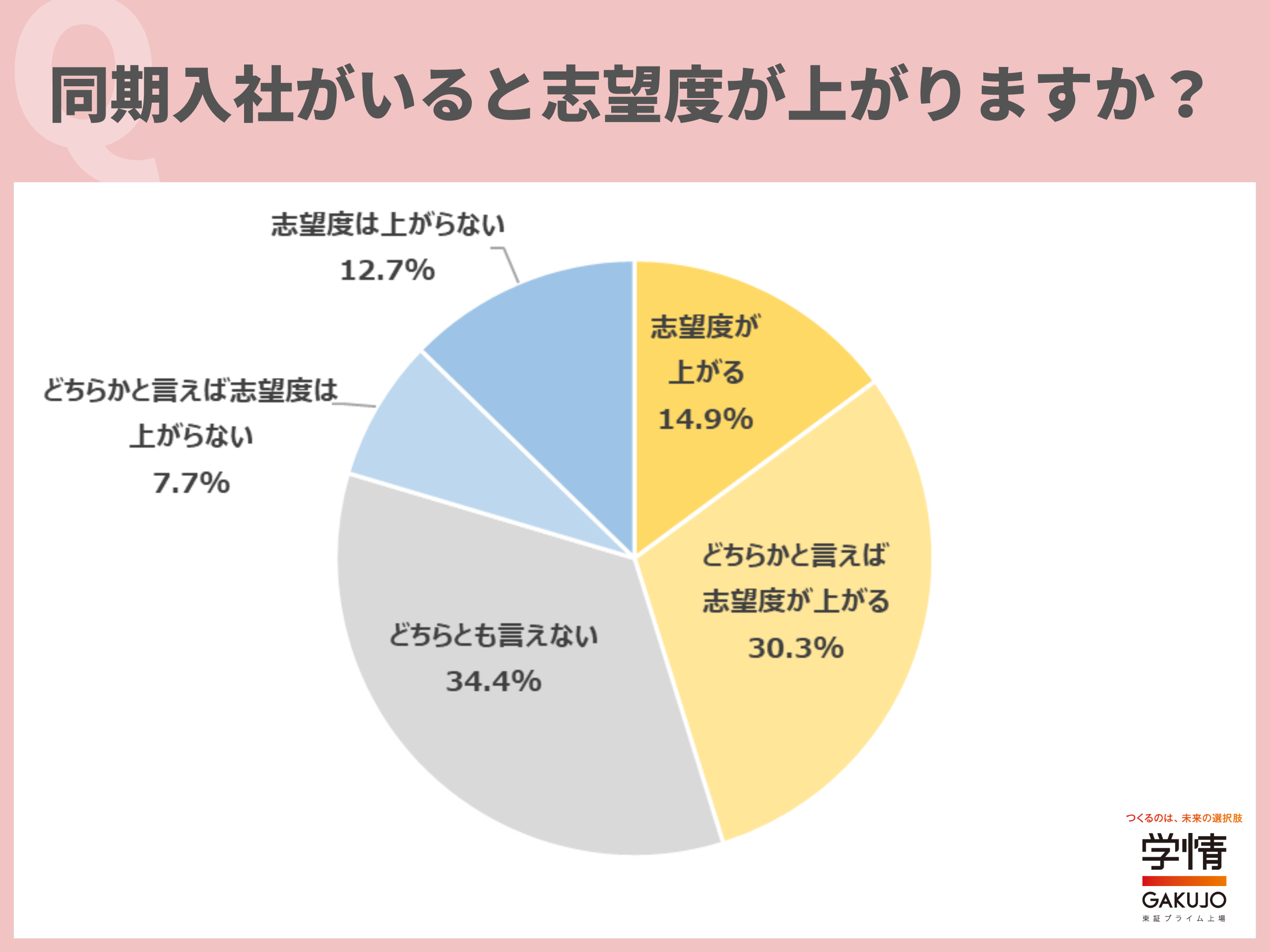 同期入社がいると、「志望度が上がる」と回答した20代は14.9%でした。「どちらかと言えば志望度が上がる」30.3%を合わせると、4割以上の20代が、同期入社がいる企業は志望度が上がるとしています。「同期がいないと志望度が下がるわけではないが、いると嬉しい」「一緒にスタート地点に立つ人がいると安心できる」といった声が寄せられました。