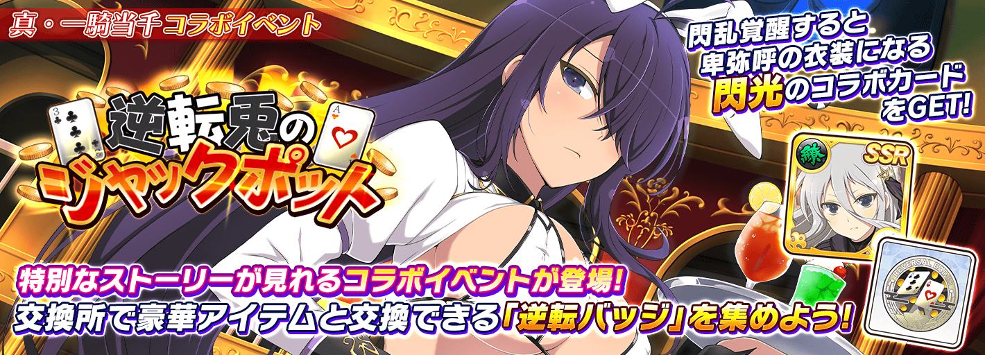 「孫策」「関羽」の新カードが登場!さらに「関羽」はコラボ初となるLRまで覚醒し、過去に登場した一騎当千コラボカード全てが復刻登場!「卑弥呼」姿の「閃光」が手に入るイベントも同時開催中!