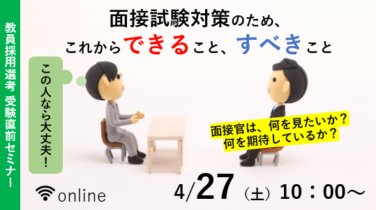 【教員採用試験】受験直前オンラインセミナー「面接試験対策のため、これからできること、すべきこと」を4/27(土)に開催!