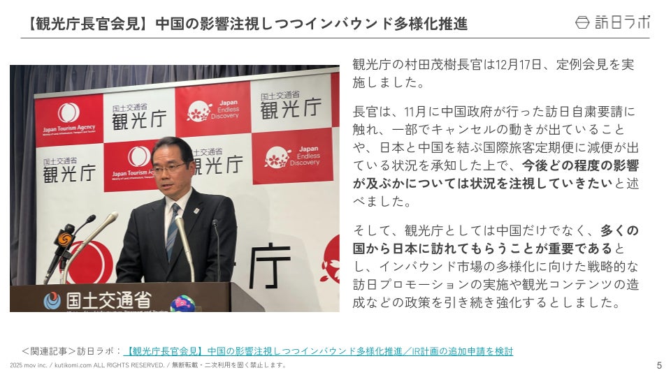 業界最大級のインバウンドビジネスメディア「訪日ラボ」及び 店舗向け集客一元化プラットフォーム「口コミコム」を運営する株式会社mov(代表取締役:渡邊 誠、本社:東京都渋谷区、以下mov)は、「インバウンドに関する最新トレンド・データ」「政府・自治体・企業などのインバウンド関連の取り組み」をはじめ、インバウンド対策に役立つニュースをまとめた「インバウンド情報まとめ【2025年12月後編】」を公開しました。