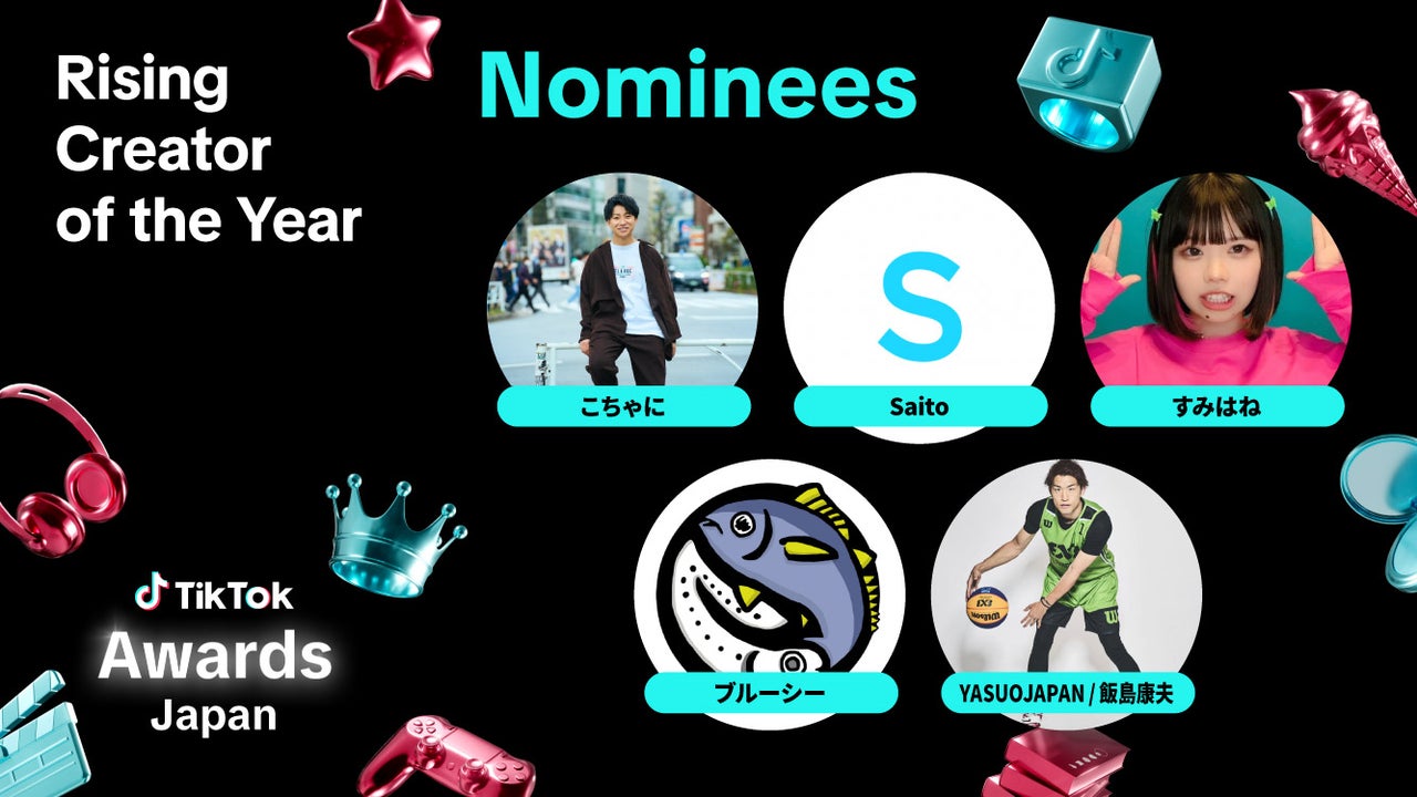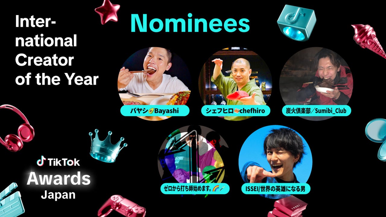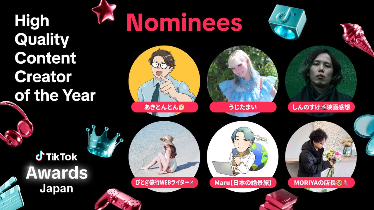 ノミネートの発表はありません。動画投稿数、再生数、いいね数やその他アプリ内のデータなどを基に総合的に判断してTikTok Japanにて決定、12月5日(木)開催の「TikTok Awards Japan」2024にて発表します。