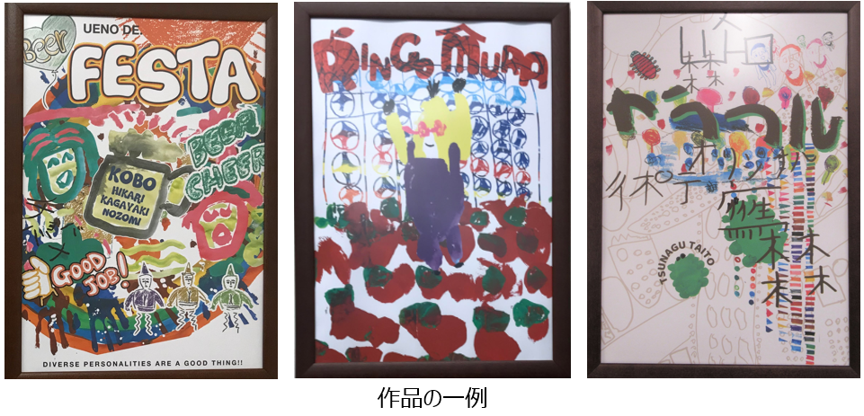 展示する作品は、東京都台東区内9カ所の障がい者施設を利用する約100名が描いた絵を、台東区社会福祉協議会より依頼を受けた福祉デザインユニットNODD(ノッド)のデザイナーが、施設ごとに障がい者が描いた絵をひとつひとつ組み合わせ作品に仕上げています。