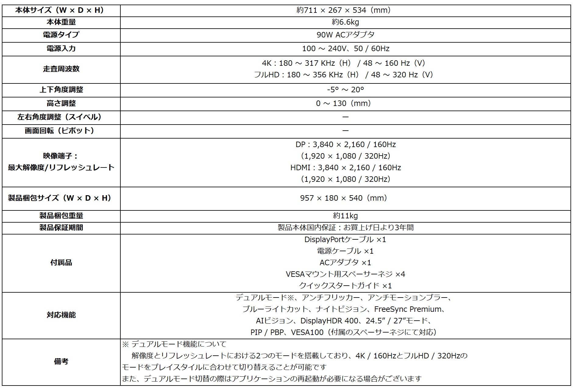 「MAG 321CUPDF」は4K / 160Hz・フルHD / 320Hzの2つのモードを素早く切り替え可能な「デュアルモード」を搭載し、高精細な映像を楽しむRPGやスピード重視のFPSなどプレイするゲームジャンルに応じて解像度・リフレッシュレートを臨機応変に切り替え可能です。肉眼に近い1,500Rの湾曲パネルと31.5インチの大画面の組み合わせにより、包み込まれるような高い没入感が特徴で、引き締まった黒を表現可能な高いコントラスト比と高速応答を実現したRAPID VAパネルを搭載し、高いゲーミングスペックかつ高画質と高い没入感を両立したゲーム体験を楽しめます。画面の表示領域を24.5インチ・27インチ相当の表示領域に切り替えるディスプレイサイズエミュレート機能、映像シーンに合わせて画面の明るさ・コントラスト・彩度を自動で調整するAIビジョン、リアルな映像表現が可能なDisplayHDR 400、同期機能としてFreeSync Premiumに対応し、思う存分ゲームプレイを楽しむことができます。また、モニターアームなどに取り付け可能なVESA規格にも対応しています。