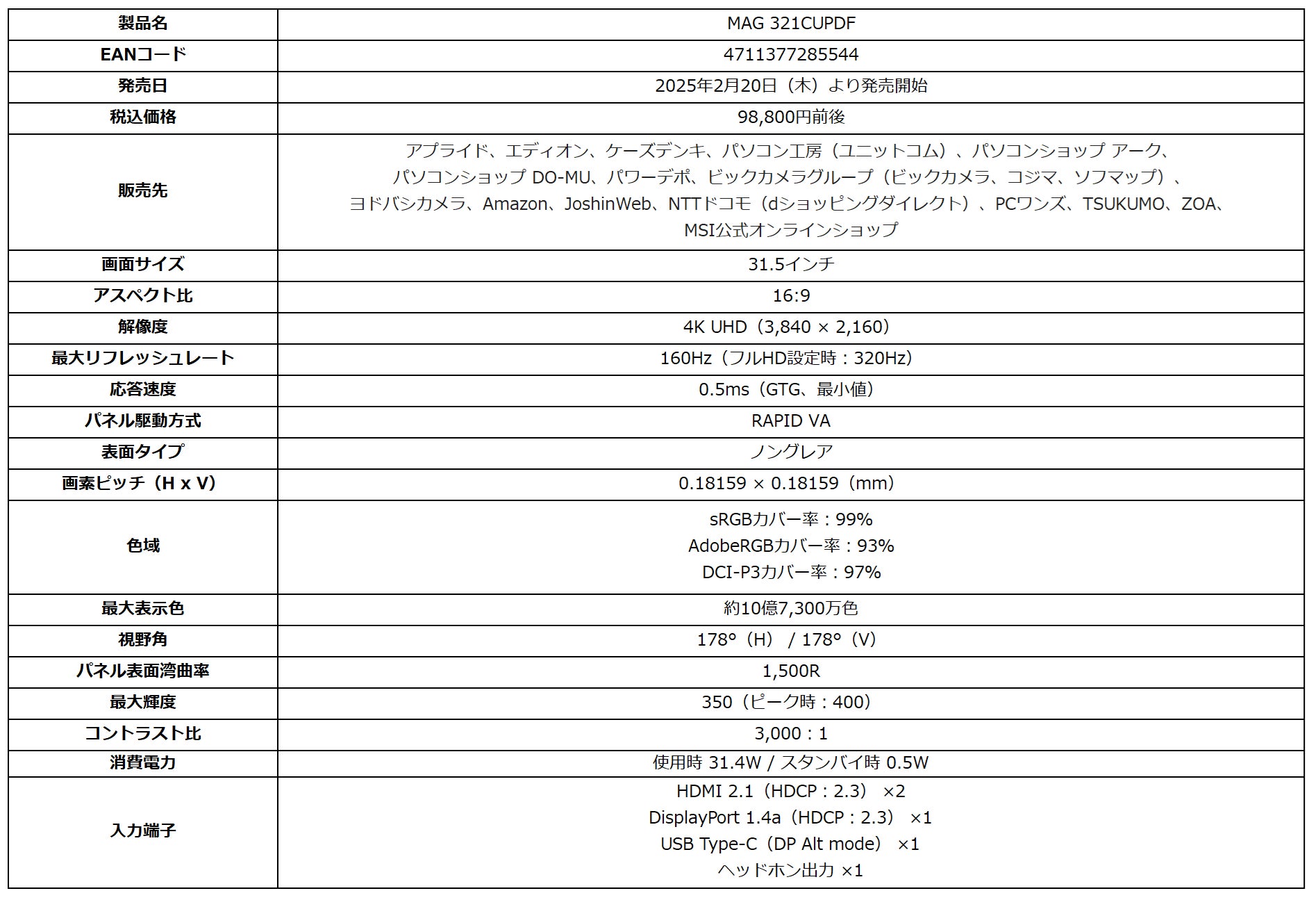 ■ MAG 321CUPDF製品ページ:https://jp.msi.com/Monitor/MAG-321CUPDF