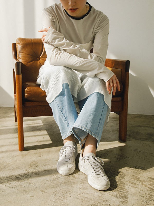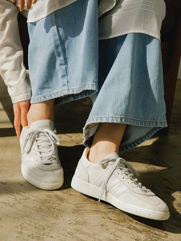 今回、スウェードアッパーには “オフホワイト”、スリーストライプスとヒールには “ライトグレー” のカラーを採用し、ワントーンながらもコントラストのある上品な印象に仕上げました。シューレースにも、スリーストライプスと同色のライトグレーを用い、細部にまでこだわった一足です。