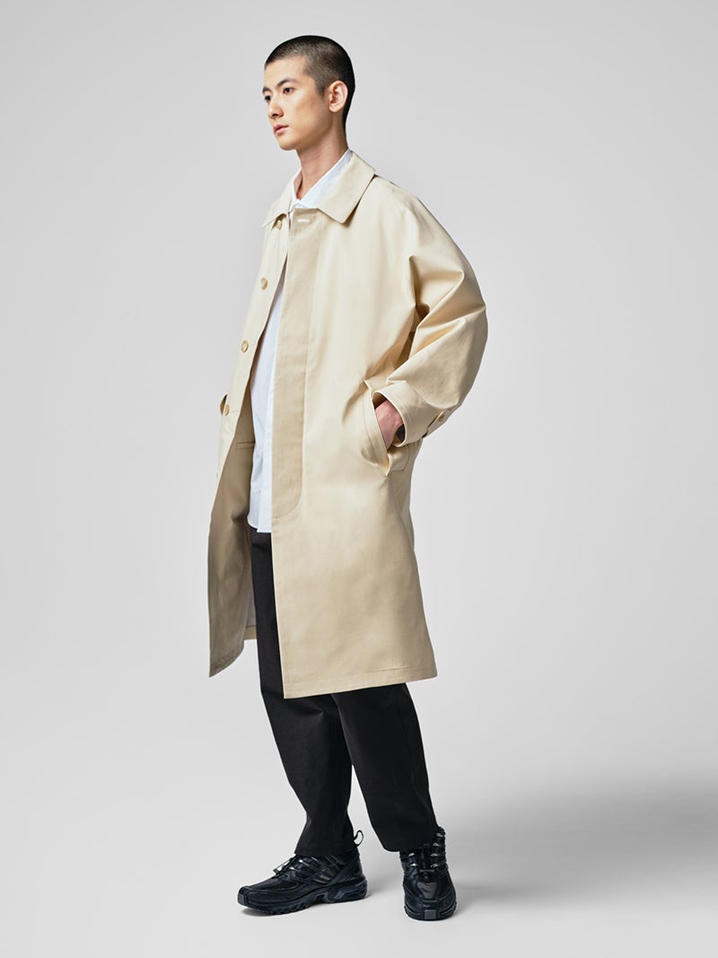 ビジネスからカジュアルまで、さまざまなシーンやスタイリングに対応する、マックコート。表地素材をBrewed Protein™繊維に置き換えて、同プロダクトをアップデートしています。シルエットはゆとりのある美しいAラインで、一枚パーツで形成される一枚袖が特徴のラグランスリーブは、その魅力を最大限に引き出しています。その他、フロントボタンを閉じたまま内側へのアクセスが可能なスルーポケットや、動きの妨げを軽減する深めのセンターベント仕様など、デザインにもこだわりました。