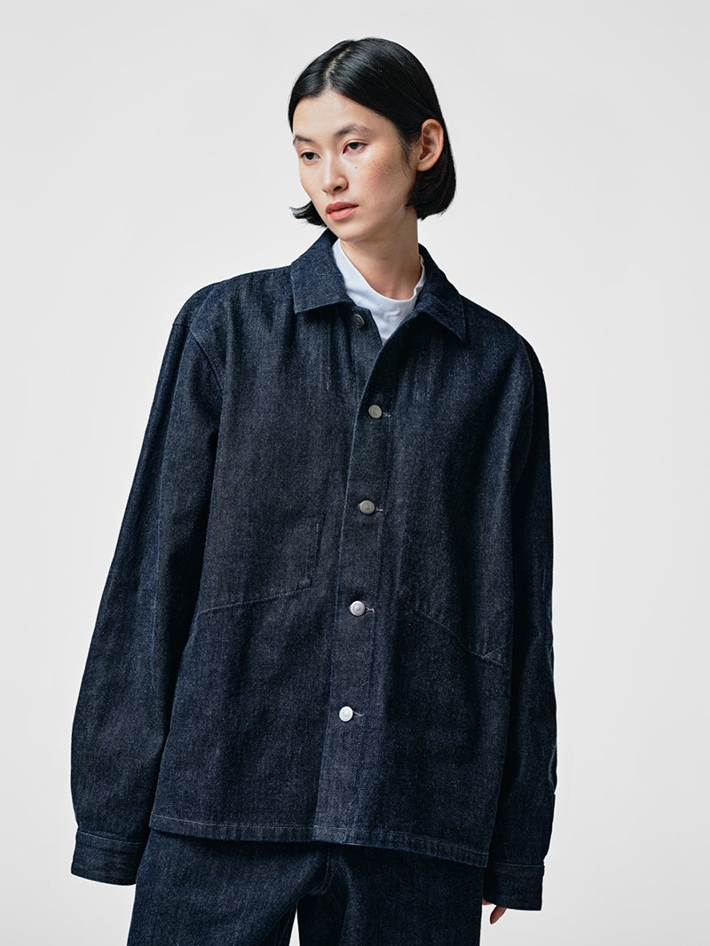 コットン素材をベースに、Brewed Protein™繊維をミックスした13オンスのデニム生地を採用。ややゆったりとしたサイズ感のボックスシルエットと、ジャケットとシャツの中間のようなデザインは共に汎用性が高くさまざまなアイテムとのコーディネートを可能にします。またデニムアイテムは、通常の製造工程よりも加工時に使用する水を約30%削減できる特殊なウォッシュ加工を施すなど、環境配慮の側面でさらなる可能性を引き出しています。
