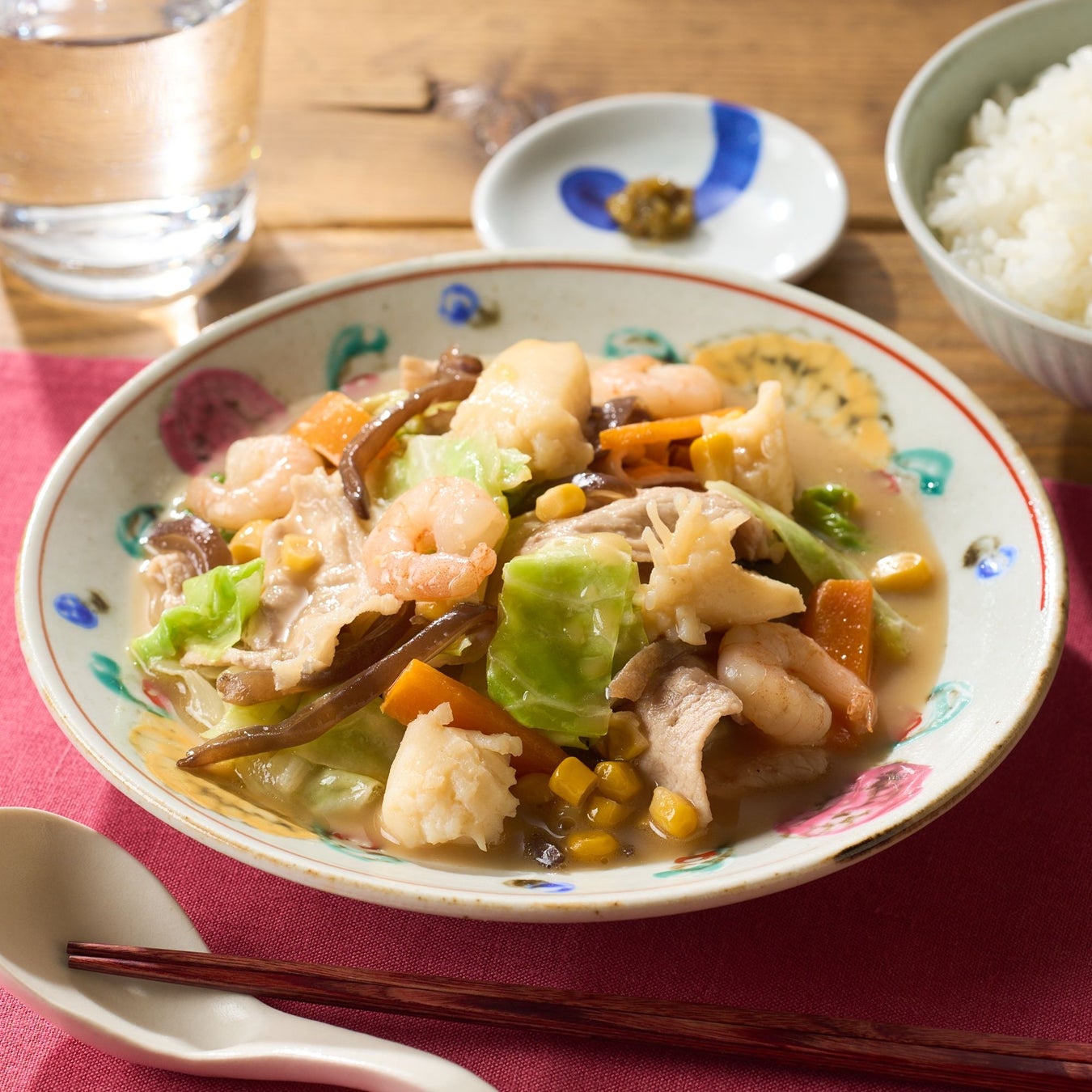 概要:ちゃんぽんの具を、ごはんに合わせられるよう炒め物に仕立てました。具材が7種類と具沢山にもかかわらず、包丁いらずで炒めるだけの簡単調理。牛乳を使用することでこっくり深みのある味わいに。別添の柚子胡椒も白湯スープと相性がよく、最後まで飽きることなくお召し上がりいただけます。