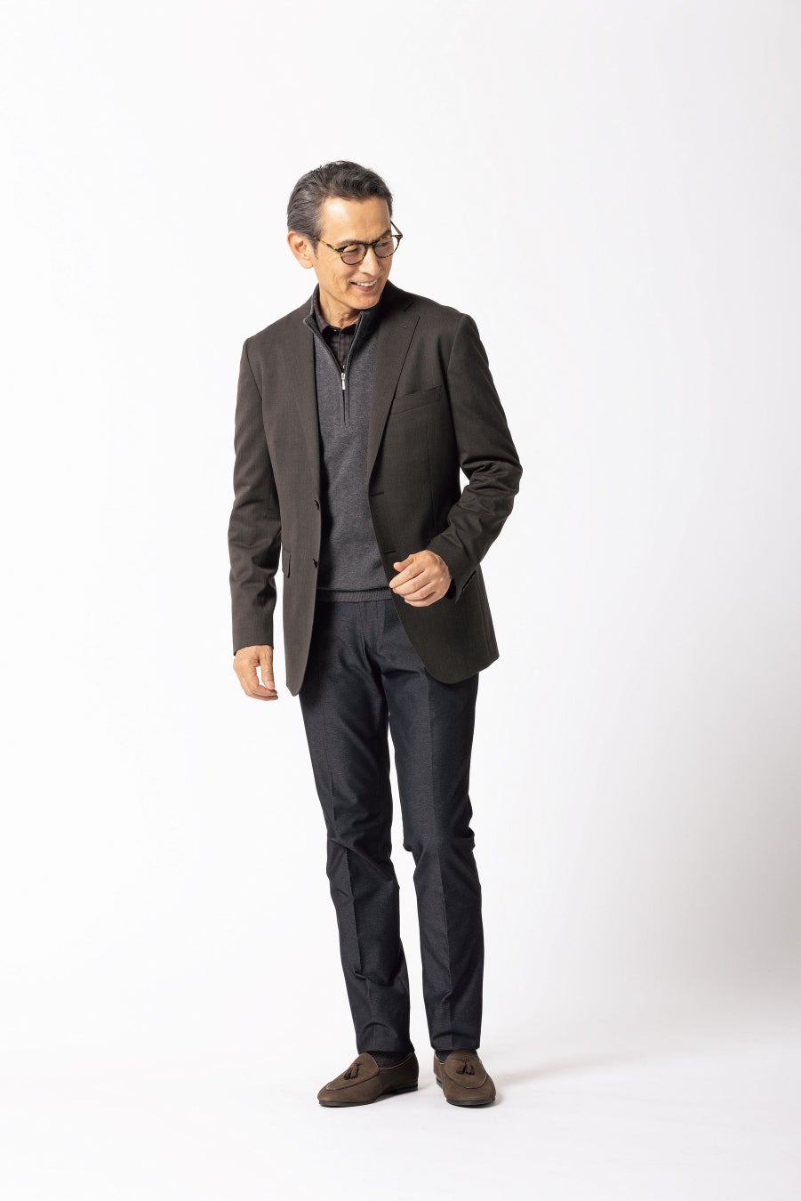 重厚感のあるブラウンと落ち着いた濃いめのグレーがシックで洗練された印象。インナーはニットにすることでリラックス感をプラスできます。