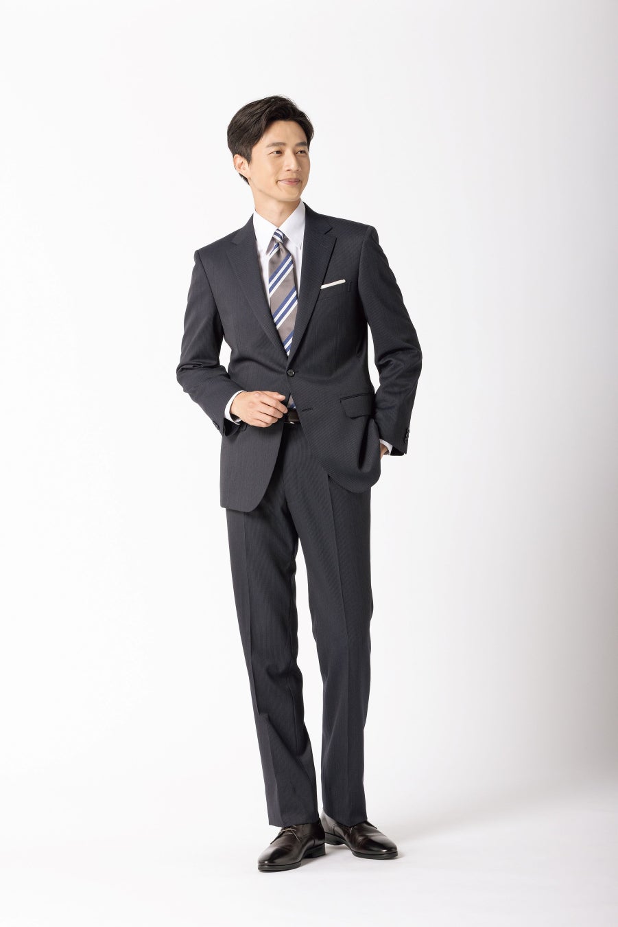 上下同商品のセットアップスタイルにネクタイを着用した、ビジネスシーンで汎用性の高い着こなしです。