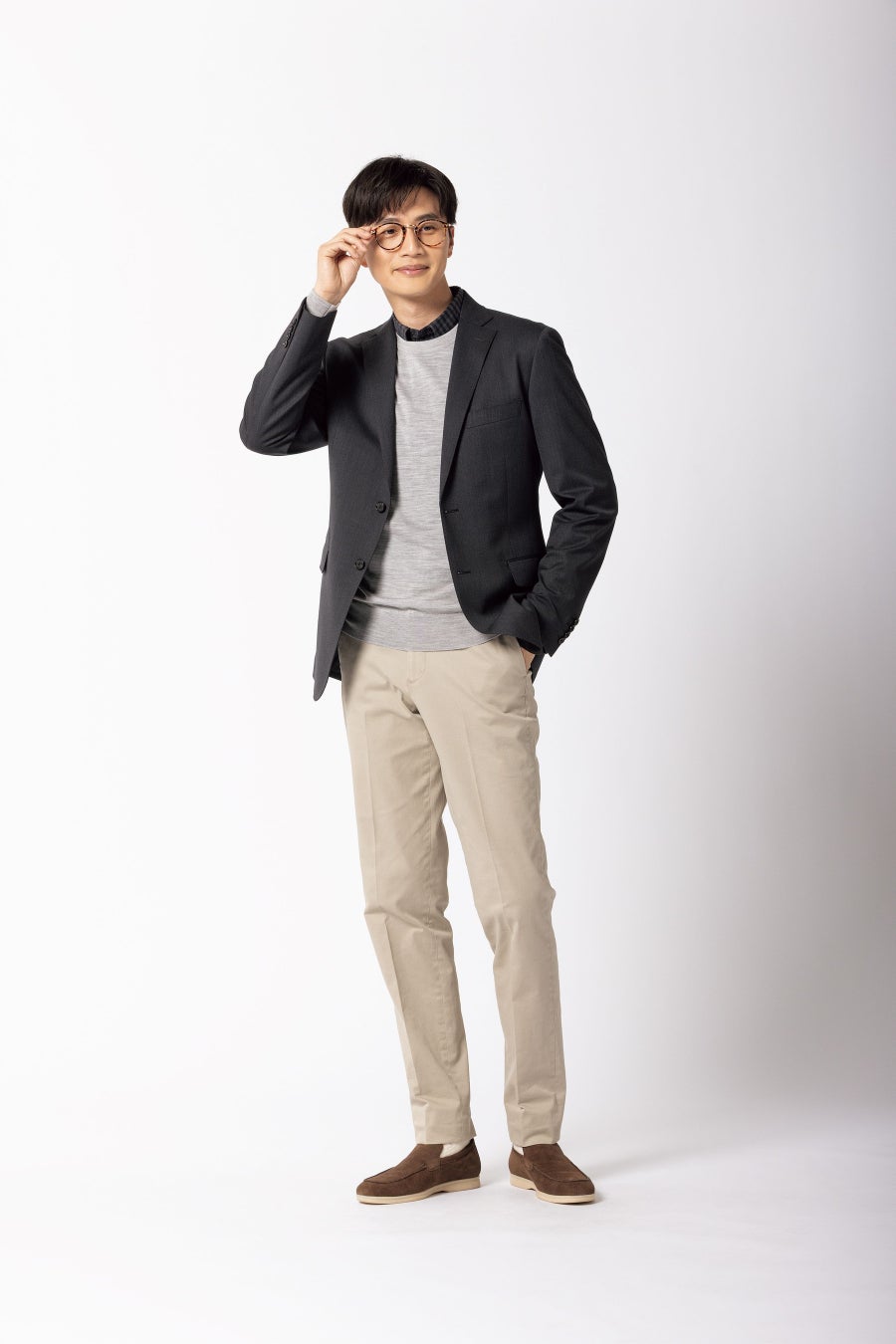 ジャケットとパンツで別の色を着用する、ビジネスカジュアルに取り入れやすい着こなしです。