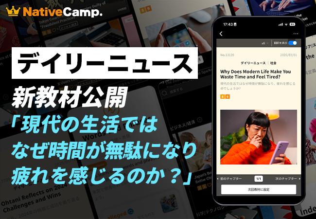 レッスン回数無制限のオンライン英会話サービス「ネイティブキャンプ英会話」を展開する株式会社ネイティブキャンプ(東京都渋谷区 代表取締役:谷川国洋)は、オリジナル教材「デイリーニュース」において、現代人が感じる“時間の浪費”や“精神的疲労”の原因をテーマにした新教材を公開したことをお知らせいたします。
