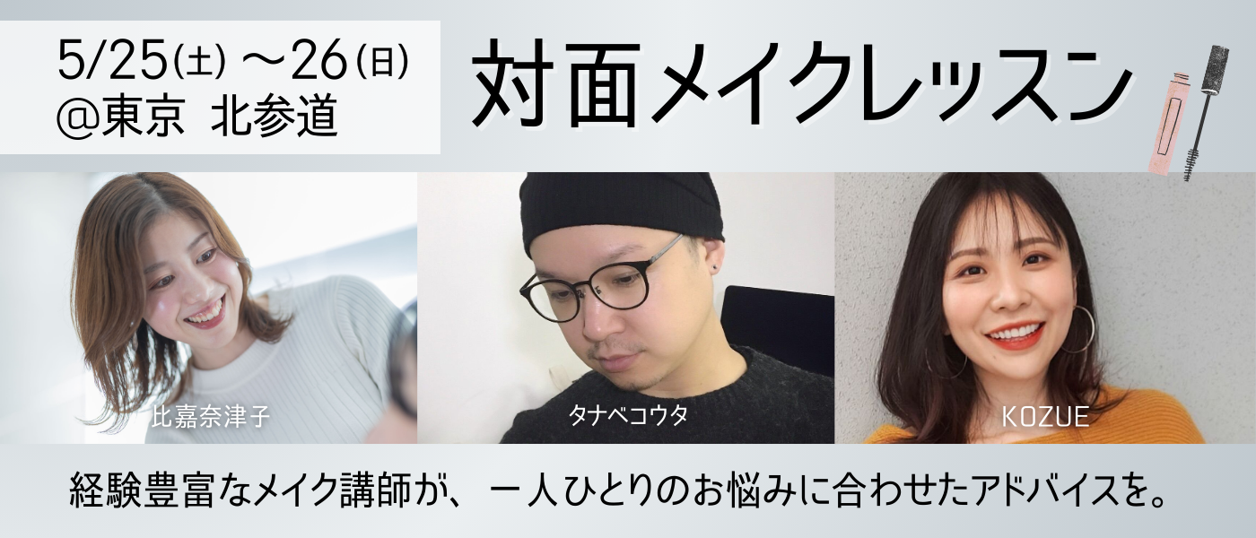 このたび5月25・26日に、本サービスに登録しているメイク講師による対面レッスンイベントを開催します。講師はパーソナルビューティーアドバイザーのKOZUE氏、メイクアップアーティストの比嘉奈津子氏、ヘアメイクアーティストのタナベコウタ氏の3名です。レッスン形式は個人レッスンとグループレッスンの2つで、内容はアイブロウなどポイントメイクに特化したレッスンや、メイクの基礎をじっくり学べるレッスン、顔分析付きのレッスンなど講師によって異なり、学びたい内容に合わせて複数のレッスンから選ぶことができます。