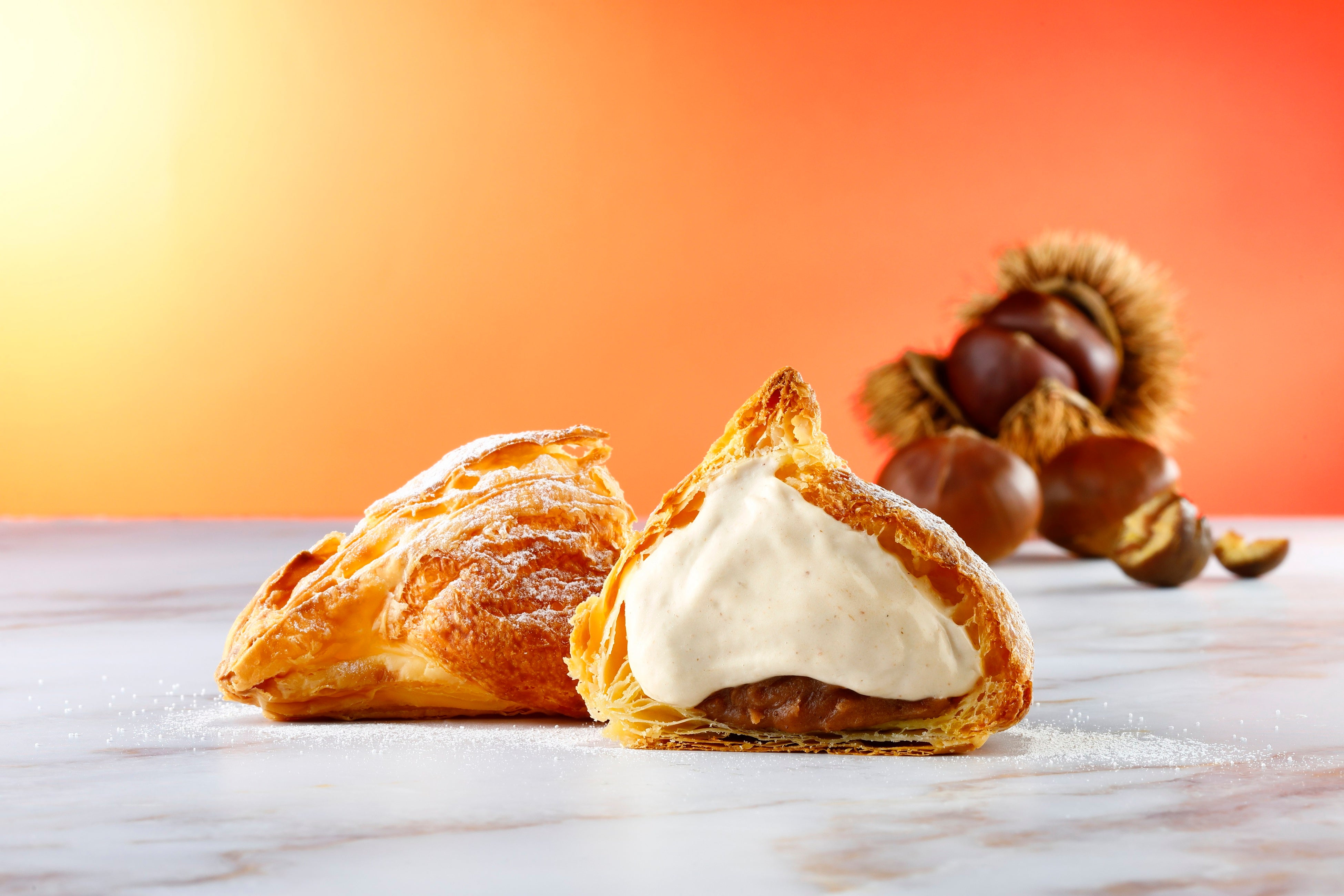 オーブンで焼き上げたサックサクのパイにクリームを入れた大人気の「ミルクパイ」の秋の季節味です!熊本県産和栗のフィリングと北海道でつくられたマスカルポーネチーズ、生クリーム、練乳で仕立てたマロンクリームに、さらに渋皮和栗のフィリングを加えました。ほんのり洋酒が香るマロン×マスカルポーネチーズの秋らしい味わいを是非お楽しみ下さいませ。