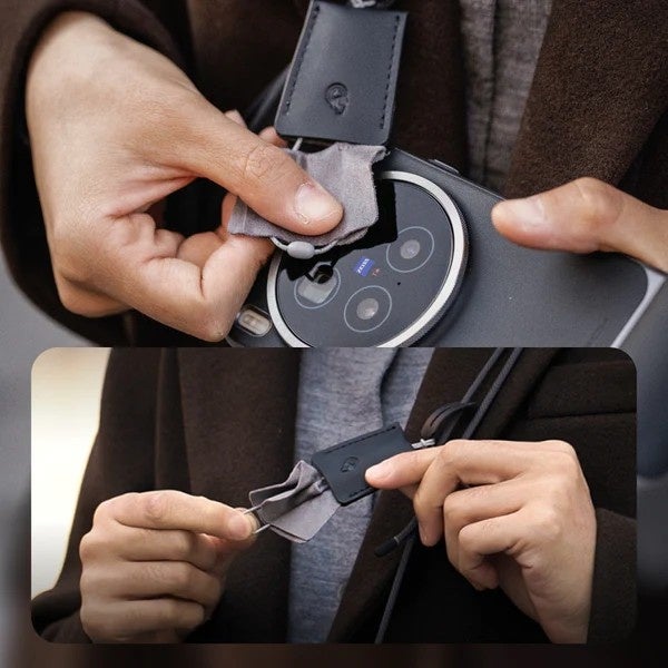 ショルダーストラップに内蔵のクリーニングクロスで、レンズや画面を手軽に拭けます。