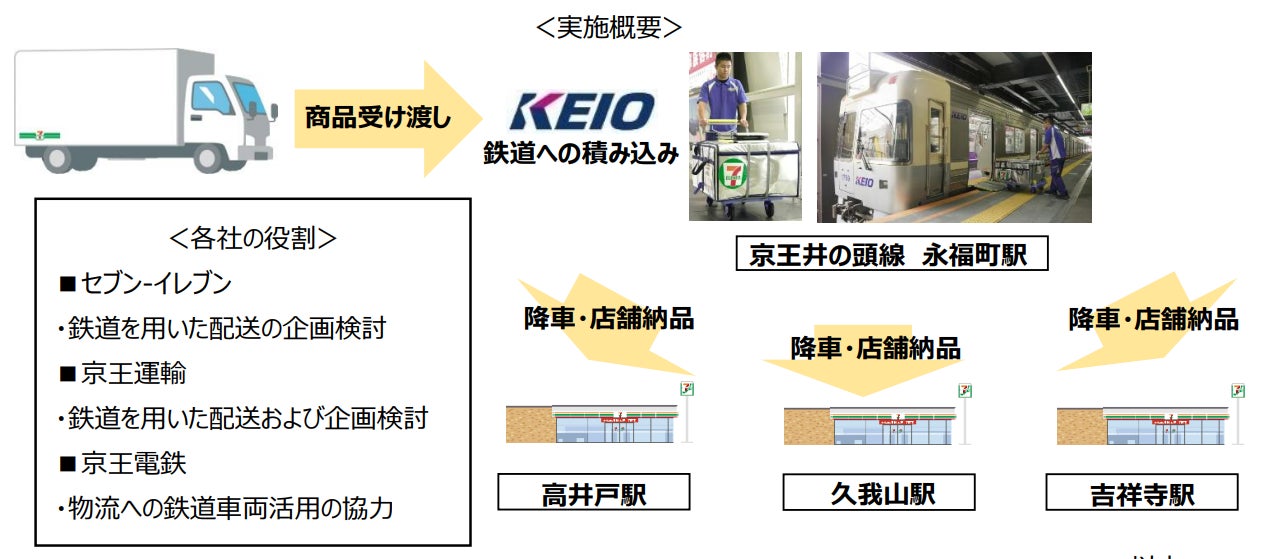 株式会社セブン‐イレブン・ジャパン(代表取締役社長:永松 文彦、以下「セブン‐イレブン」)と京王運輸株式会社(代表取締役社長:大村 健)は、12月10日(火)から、都内を走る京王電鉄株式会社 (代表取締役社長:都村 智史)の京王井の頭線(以下「当該沿線」)駅構内において株式会社京王 ストアが運営するセブン‐イレブン店舗への商品納品について、鉄道による商品配送の実証実験を開始します。