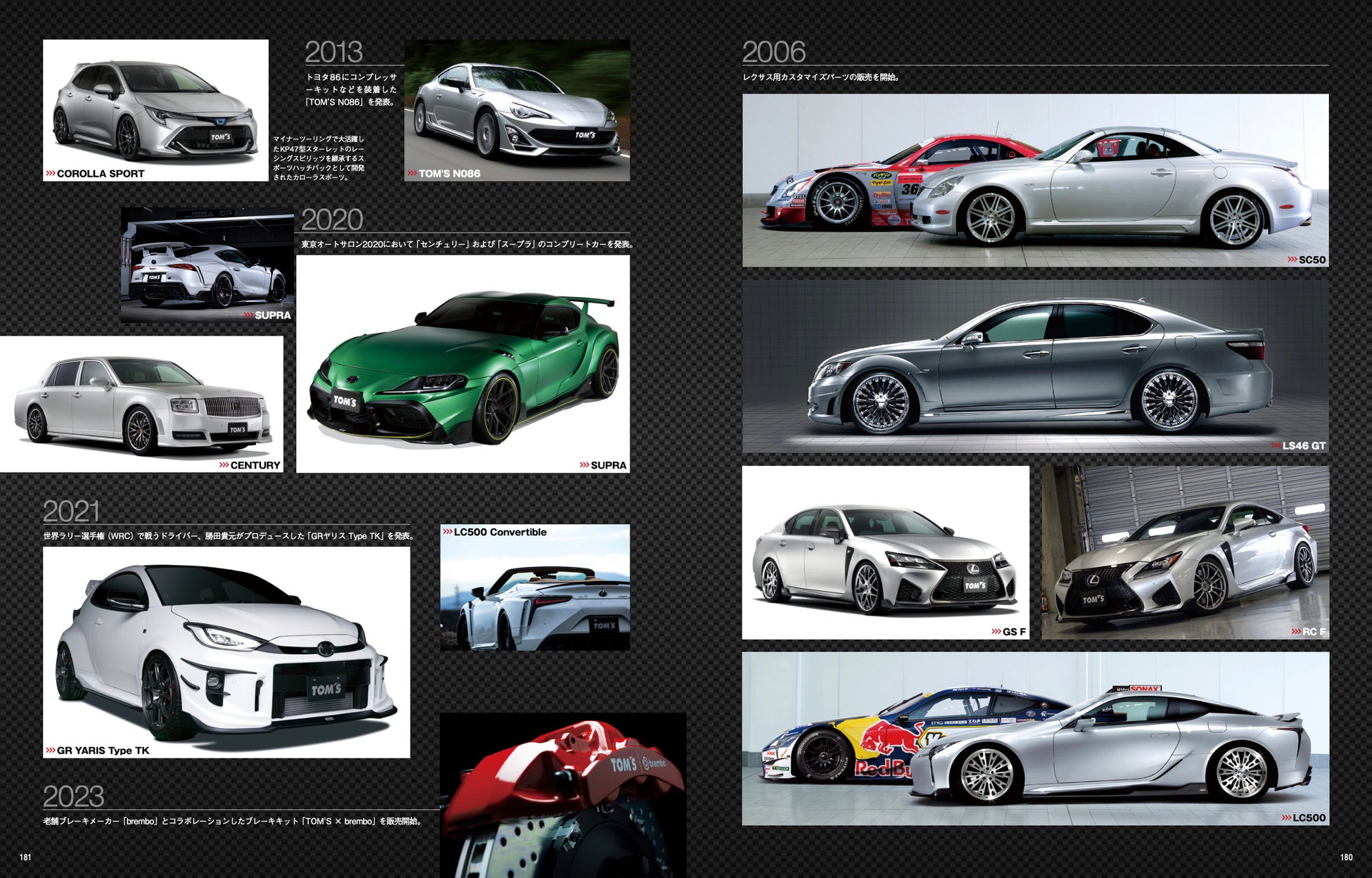 このほかアフターマーケットで注目された歴代の主要コンプリートカーやトムス・ブランドの代表的なカスタマイズパーツ史に加え、新世代トムスを象徴する、シティサーキット東京ベイの紹介と展望、ひろしまモビリティワールドの構想など未来へ向けた各種新規事業も取り上げています。まさに、トムスの魅力が詰まった一冊となっていますので、ぜひこの機会にお買い求めください。