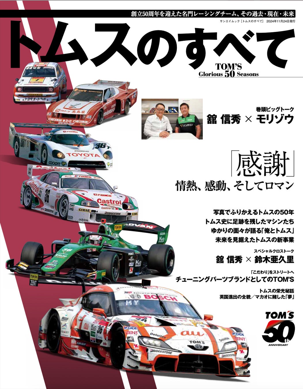 国内外のモータースポーツで輝かしい記録を残してきた株式会社トムスは、2024年に創業50周年という大きな節目を迎えました。本書はトムスの全面監修のもと、感謝、情熱、感動、そしてロマンをテーマにした、完全保存版の記念ムックとなっております。