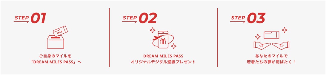 また、上記に加え、日本中の大人たちで、夢を追う若者たちを応援できるよう、JMB会員の皆さまがご自身の持つマイルを寄付すると、1マイル=1円相当として、いただいたマイル相当額の航空券を提供していき、大人たちもこのプロジェクトに参画できる仕組みとしました。