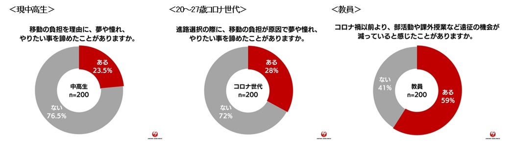 実際に、現中高生・大学生~若手社会人の世代への調査によると、約4人に1人が「移動を理由に夢を諦めたことがある」と答えた結果となりました。また、部活動顧問ら教員への調査によると全体の6割以上が、現役の学生は他の世代と比べて移動機会が減っている実感が「ある」と答えるなど、移動機会の減少による他世代との「体験格差」の影響が明らかに見てとれます。 (JAL調べ 2024年9月実施)
