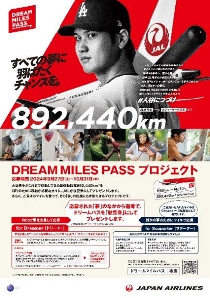 JALは、「移動を通じた関係・つながり」を創出することで、お客さま・地域社会と共にサステナブルな未来の実現を目指しています。その一環として、JALは今回、JALマイレージバンク(以下「JMB」)会員と共に「移動」への支援を通じて、大谷選手のように夢を追い次世代を担う若者たちを応援する「DREAM MILES PASS」プロジェクトを2024年9月27日(金)より始動します。