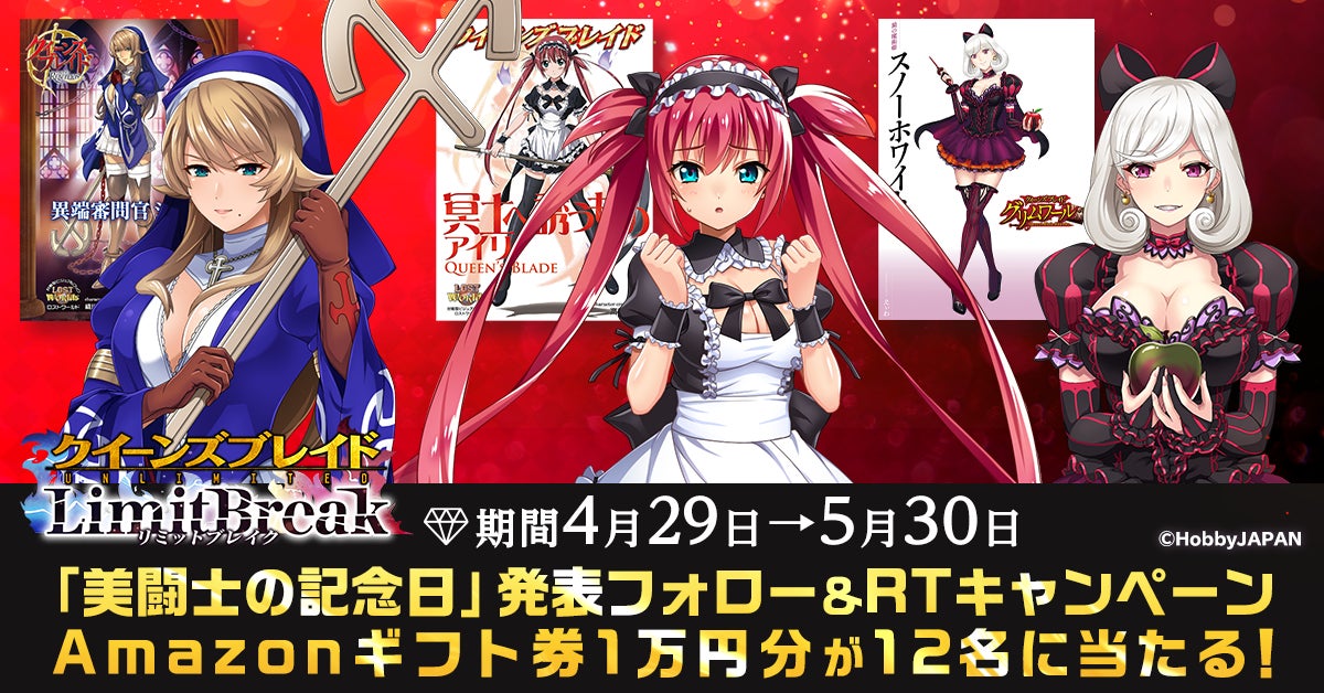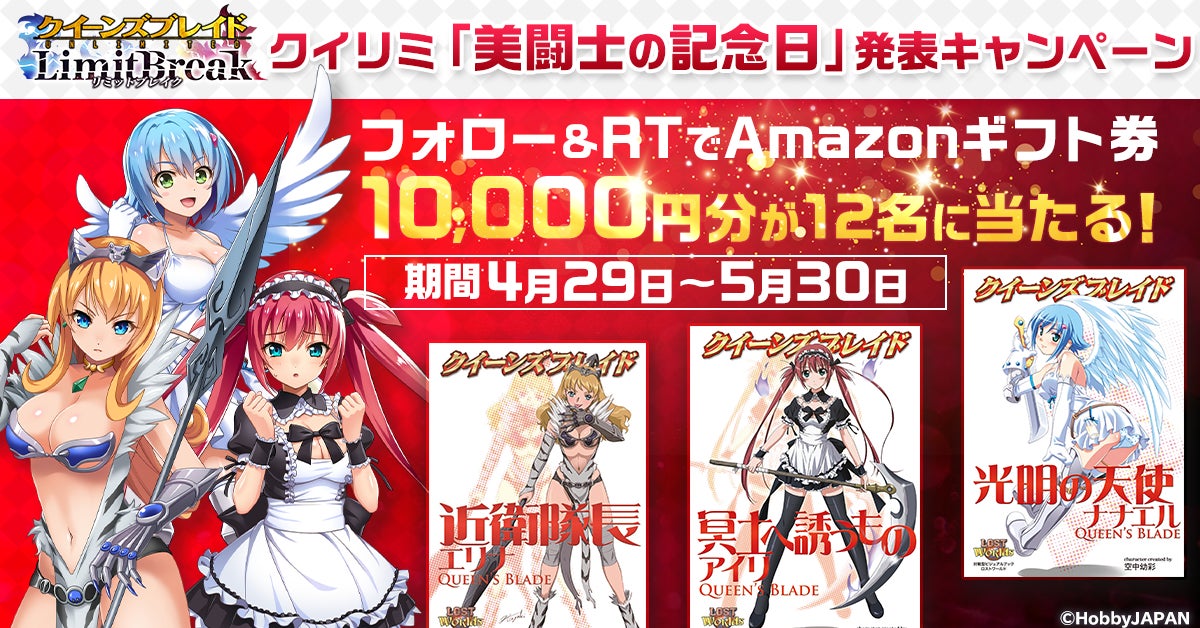 CTW株式会社は、ゲームサービス「G123」にて配信中のHTML5ゲーム『クイーンズブレイドリミットブレイク』(以下クイリミ)にて、「美闘士の記念日」を制定することをお知らせいたします。併せて、各美闘士の記念日を、Amazonギフト券10,000円分が抽選で12名に当たるフォロー&RTキャンペーンを実施しながら発表いたします。
