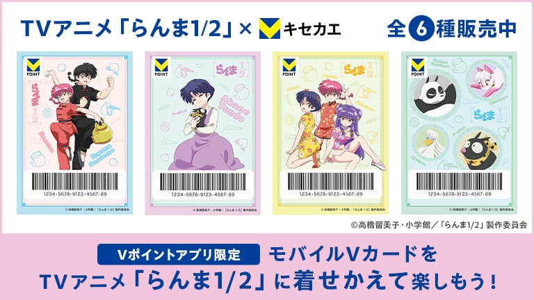 CCCMKホールディングス株式会社(本社:東京都渋谷区、代表取締役社長兼CEO:髙橋誉則)は、Vポイントアプリの「モバイルVカード」を好きなデザインに着せかえできる「Vキセカエ」(https://ip.tsite.jp/guide)において、TVアニメ『らんま1/2』より、メインキャラクターを中心としたデザイン全6種を、2025年3月18日(火)から2026年3月18日(水)まで期間限定で販売いたします。