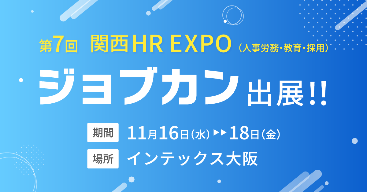 株式会社社DONUTS(東京都渋谷区、代表取締役:西村啓成)が提供するバックオフィス支援クラウドEPRシステム『ジョブカン』は、11月16日(水)~18日(金)にインテックス大阪にて開催される「第7回 【関西】HR EXPO(人事労務・教育・採用)」に出展します。