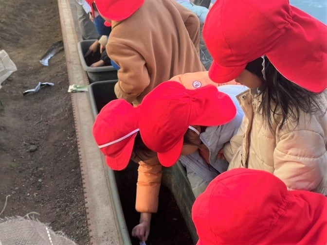 特別授業は、園に通う5歳クラス(年長)の幼児15人を対象に実施しました。初回は「たべものをおいかけよう」として1月22日(木)に実施しました。いつも食べている食品を食卓からたどり、輸送や加工、さらに原料の生産までさまざまな人が関わっていることを説明しました。その後、幼児は屋外へ移動し、プランターで野菜の種を植えました。