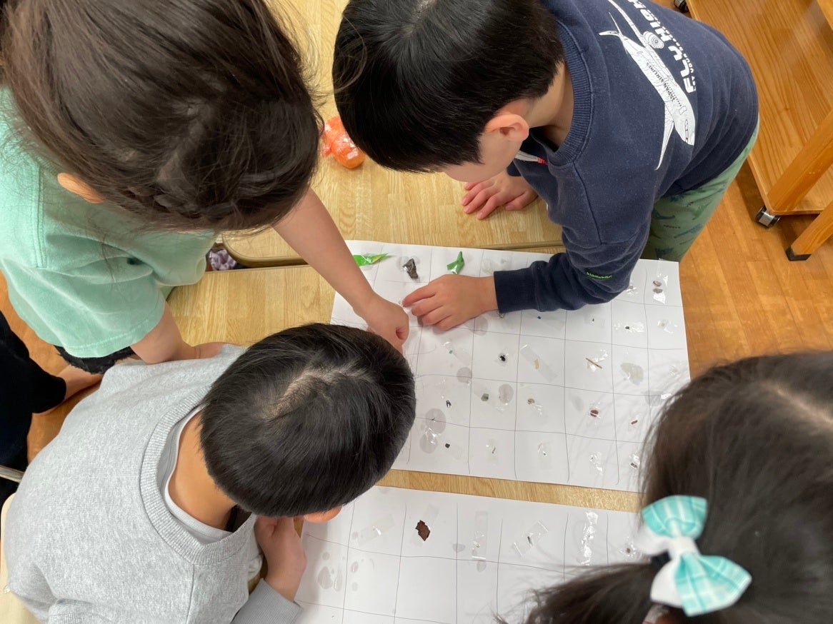 2回目は「プラスチックをしろう」をテーマに2月19日(木)に実施しました。プラスチックはさまざまな生活の場面で使用され、ポイ捨てなどで適正に処理されないとマイクロプラスチックとなるまでを紹介しました。体験では、海岸の砂を水に漬け、水面にマイクロプラスチックが浮かんでくるようすを観察しました。
