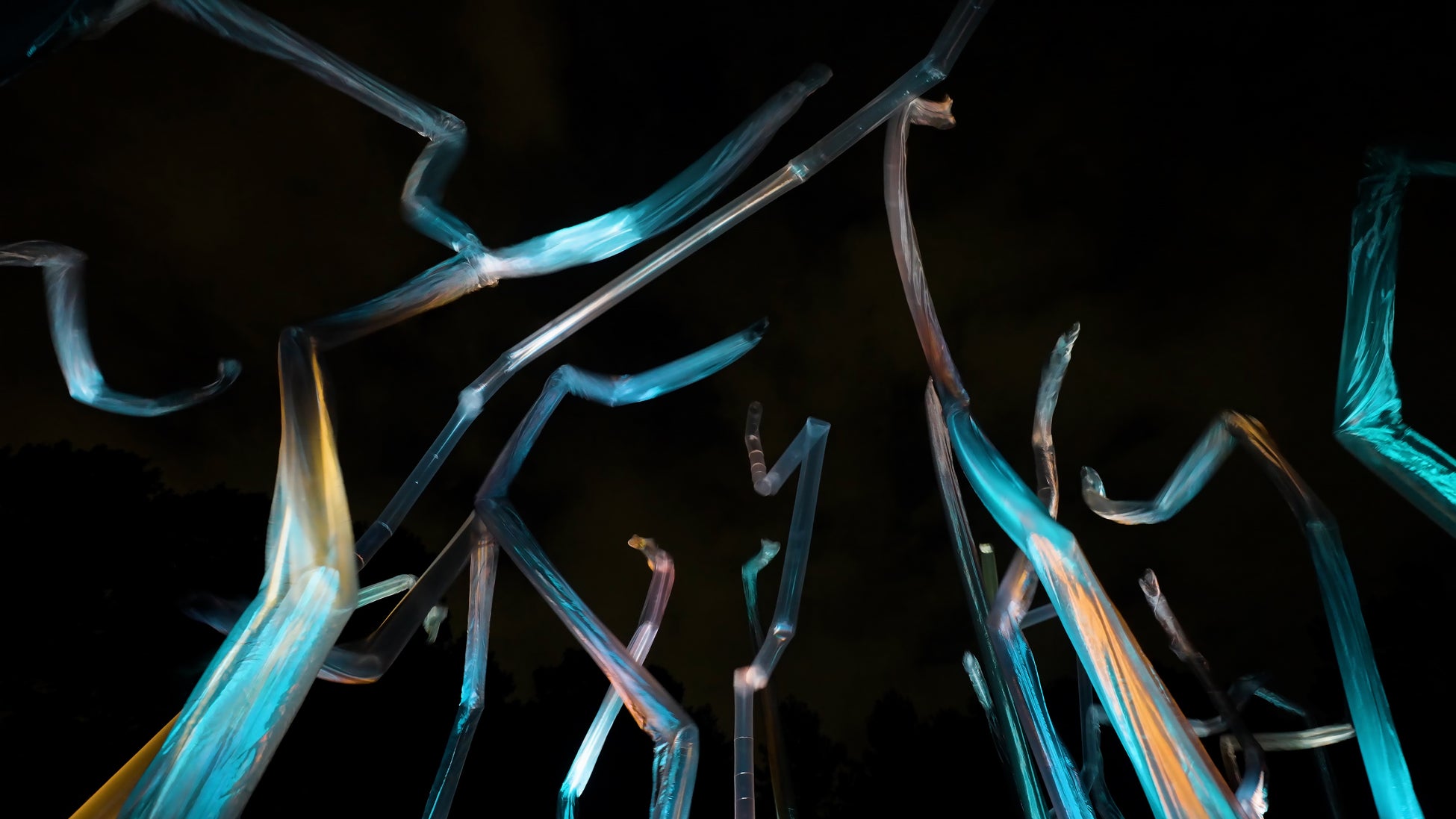 大阪市の長居植物園に常設している、チームラボによる夜の野外ミュージアム「チームラボ ボタニカルガーデン 大阪」で、環境や人々の影響を受けて変容する作品《風と共に踊る柱群》を今年も公開します。7月25日(金) から公開予定。