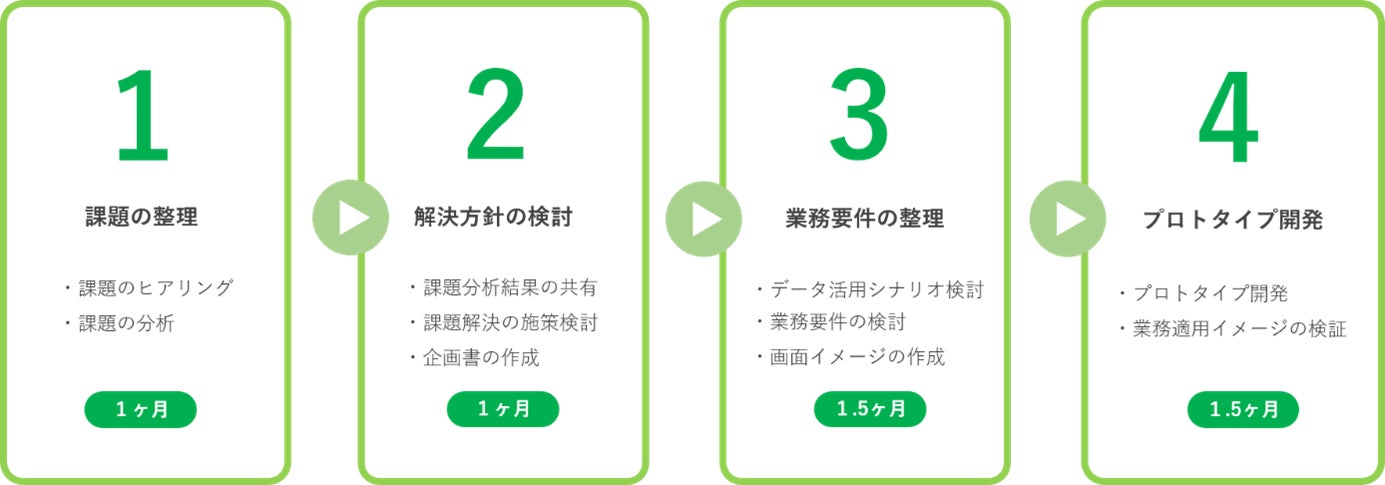銀行ごとに、データ活用における銀行業務の課題整理、課題解決に向けた方向性の検討・企画作成、企画内容に沿った業務要件の整理、課題解決のためのシステム構築(プロトタイプ開発)を行うことで営業DXを推進する取り組みです。銀行ごとの課題や目的を反映した企画を策定するため、インテックが各行と共同プロジェクトを立ち上げ、企画段階からシステム構築までの各プロセスをともに推進していきます。