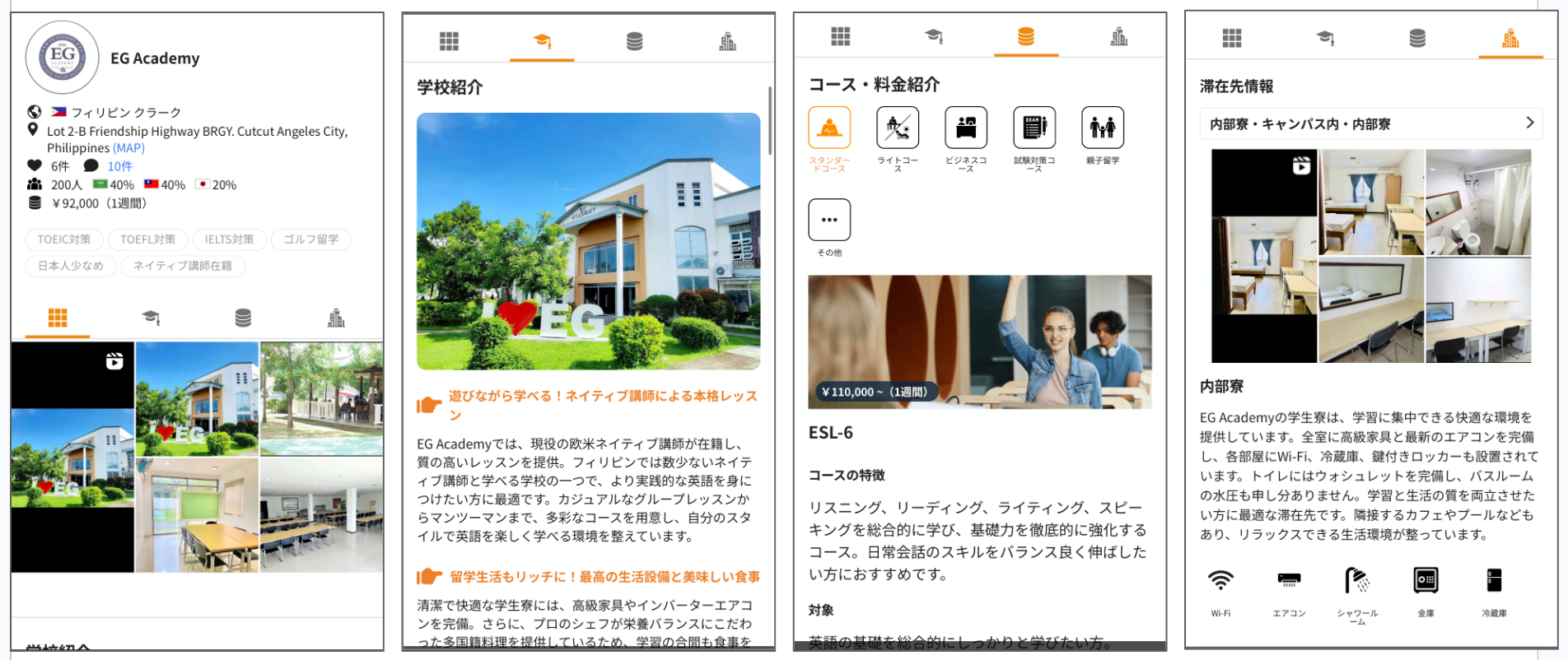 ネイティブキャンプ留学では、ユーザーが必要な情報を分かりやすく把握できるよう、常に丁寧で明確な情報提供を心がけています。EG Academyの詳細情報は、以下の4つのカテゴリーに分けて掲載しており、知りたい情報を的確にお届けします。
