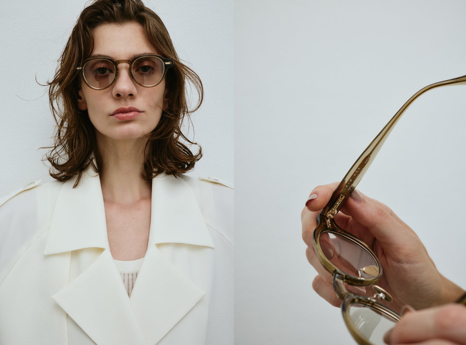 RIM.ARKのシンプルでミニマルな装いにYUICHI TOYAMA.のアイウェアをプラスすることで、ブランドフィロソフィーである揺るぎない芯をもつ、自立した女性像を具現化できると考えます。