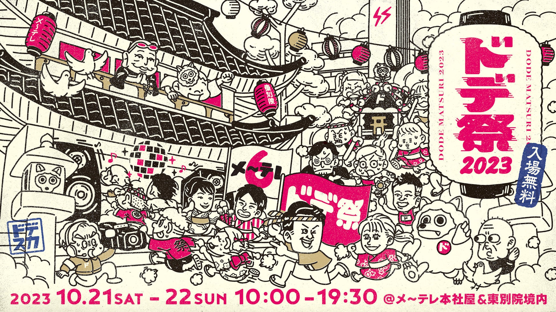 これまで「ドデスカ!」を支えてくださっている東海3県の皆様に日頃の感謝を伝えるとともに、改めてこれからのご挨拶をしたい。そんな思いから、メ~テレは2023年10月21日(土)-22日(日)の2日間、「ドデ祭2023」をメ~テレ本社屋と東別院境内で開催いたします。