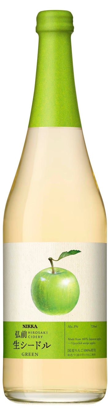 『ニッカ弘前 生シードル グリーンシードル』は、リンゴの栽培過程で摘み取られる熟す前のリンゴを使用して醸造したスパークリングワインです。甘みが少なく、ポリフェノールが多く含まれる熟す前のリンゴで作られるため、甘すぎないほのかな酸味・渋みと爽やかな香りを楽しめます。リンゴ栽培では、大きく、おいしいリンゴを作るために、1本の木にできる実の約9割を熟す前に摘み取られます。摘み取られるリンゴの一部をアップサイクルすることで、食品廃棄ロスの削減やリンゴ農家の支援を目指します。赤く色づく前のリンゴを使用した商品であるため「グリーンシードル」と名付け、パッケージの中心に熟成前のリンゴの大きなイラストを配することで、商品の特長を分かりやすく訴求しています。