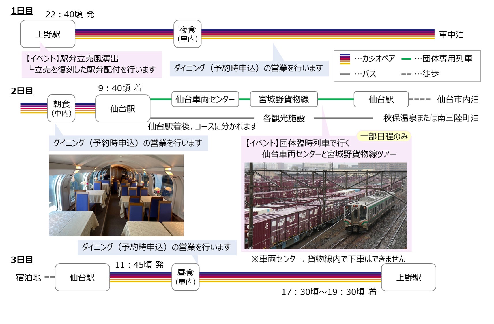 仙台駅到着後に別の団体専用列車に乗り換え、仙台車両センターと宮城野貨物線に入線します。仙台車両センターではE26系カシオペア車両の隣に停車し、団体専用車両からカシオペア車両を眺めることができます。また仙台統括センター社員が添乗し、ガイドをいたします。